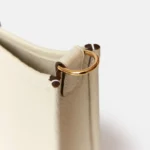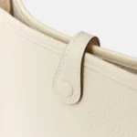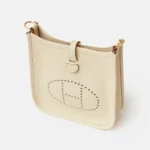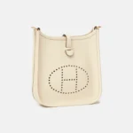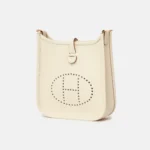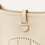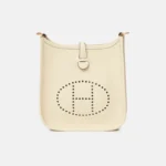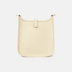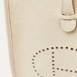 The Hermès Mini Evelyne 16 (TPM) is a modern, effortlessly chic crossbody prized for its minimalist design and everyday practicality. This example is crafted in Nata Taurillon Clémence leather, a soft, creamy off-white shade that offers a clean and refined aesthetic. The supple, pebbled Clémence leather provides a relaxed yet luxurious structure, complemented by gold-plated hardware (GHW) for a warm, classic finish.